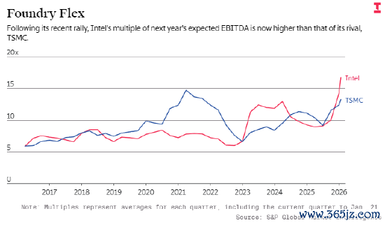 2024 至 2025 年的大部分时间里,以预期税息折旧及摊销前利润(EBITDA)的市盈率衡量,英特尔的股价一直低于全球芯片制造龙头企业台积电。但随着股价持续走高,英特尔当前的预期税息折旧及摊销前利润市盈率已升至 20 倍,创下 2021 年以来的最高水平,远超台积电目前 12.5 倍的市盈率。以明年预估销售额计算的市盈率来看,英特尔股价也处于至少十年来的最高点。
