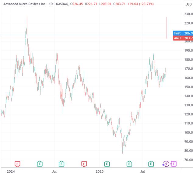 周一的关键词依然是 OpenAI。公司先是宣布与 AMD 达成 6 吉瓦 GPU 部署的协议,并将根据部署进度分阶段解锁最多 1.6 亿股 AMD 普通股的认股权证,相当于后者 10% 的股权。受此消息影响,AMD 周一收涨 23.71%,单日市值增加 633 亿美元,相当于人民币 4500 亿元。